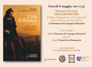Giovedì 8 maggio 2025 alle ore 17:30 presso Casa Barnekow (Via Vittorio Emanuele, 83) di Anagni (FR), si terrà la presentazione del volume Cola di Rienzo di Tommaso di Carpegna Falconieri. Dialoga con l’autore il prof. Gioacchino Giammaria.