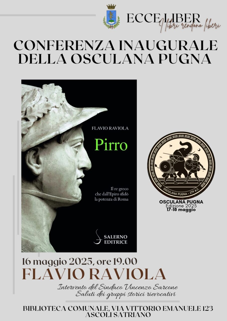 Venerdì 16 maggio, alle ore 19.00, presso la Biblioteca Comunale “Pasquale Rosario” di Ascoli Satriano (Corso Vittorio Emanuele II, 123), nell’ambito della rievocazione storica Osculana Pugna – La battaglia di Pirro 279 A.C., si terrà la presentazione del volume Pirro di Flavio Raviola. Interviene il Sindaco Vincenzo Sarcone. Saluti dei gruppi storici rievocativi. Sarà presente l’autore.