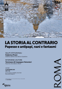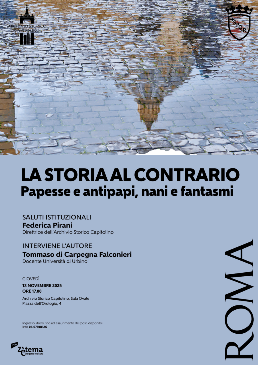 Giovedì 13 novembre 2025 alle ore 17.00 nella Sala Ovale dell’Archivio Storico Capitolino di Roma (Piazza dell’Orologio, 4), si terrà la presentazione del volume La storia al contrario. Papesse e antipapi, nani e fantasmi di Tommaso Di Carpegna Falconieri. Saluti istituzionali di Federica Pirani (Direttrice dell’Archivio Storico Capitolino). Interviene l’autore Tommaso Di Carpegna Falconieri.