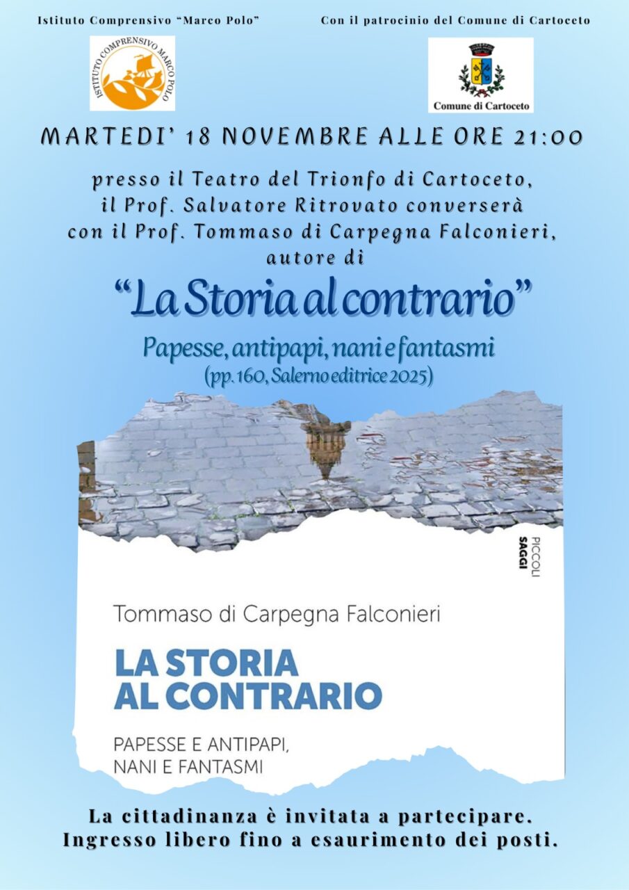 Martedì 18 novembre 2025, alle ore 21.00, presso il Teatro del Trionfo (Piazzale Guglielmo Marconi, 2) di Cartoceto (PU), si terrà la presentazione del volume La storia al contrario. Papesse e antipapi, nani e fantasmi di Tommaso Di Carpegna Falconieri. Dialoga con l’autore il Prof. Salvatore Ritrovato.