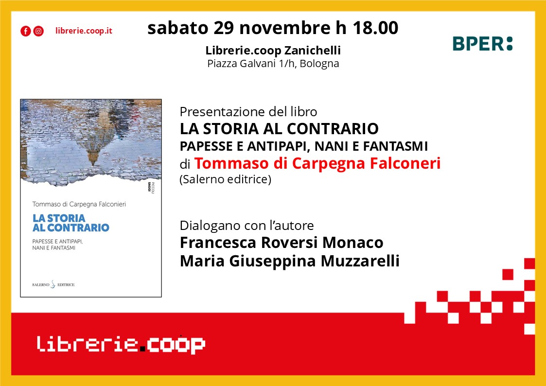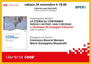 Sabato 29  novembre 2025, alle ore 18.00, presso Librerie.coop Zanichelli di Bologna (P.zza Galvani, 1/h), si terrà la presentazione del volume La storia al contrario. Papesse e antipapi, nani e fantasmi di Tommaso Di Carpegna Falconieri. Dialogano con l’autore Francesca Roversi Monaco e Maria Giuseppina Muzzarelli.