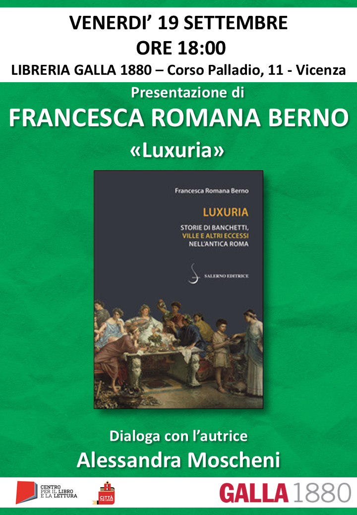 Venerdì 19 settembre 2025 alle ore 18:00 presso la Libreria GALLA 1880 di Vicenza (Corso Palladio, 11), si terrà la presentazione del volume Luxuria. Storie di banchetti, ville e altri eccessi nell’antica Roma di Francesca Romana Berno. Dialoga con l’autrice Alessandra Moscheni.
