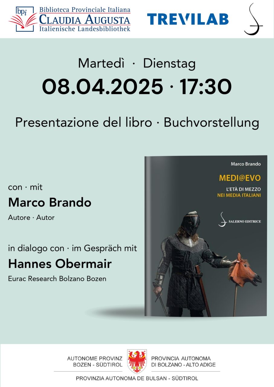Martedì 8 aprile 2025, alle ore 17.30, alla Biblioteca provinciale italiana “Claudia Augusta” di Bolzano presso il Centro Trevi – TreviLab (Via Marconi, 2), si terrà la presentazione del volume Medi@Evo.L’Età di mezzo nei media italiani di Marco Brando. Dialoga con l’autore Hannes Obermair (Eurac Research Bolzano).