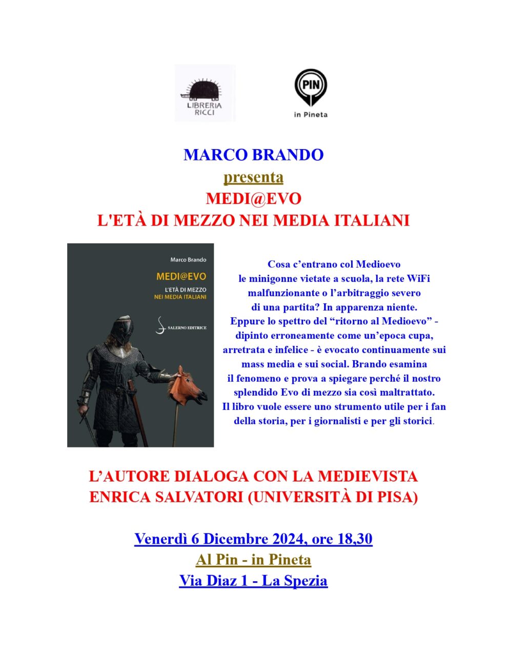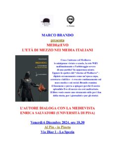 Venerdì 6 dicembre 2024 alle ore 18.30 presso PIN – In Pineta di La Spezia  (Via Armando Diaz, 2), si terrà la presentazione del volume Medi@Evo.L’Età di mezzo nei media italiani di Marco Brando. Dialoga con l’autore la medievista Enrica Salvatori (Università di Pisa).