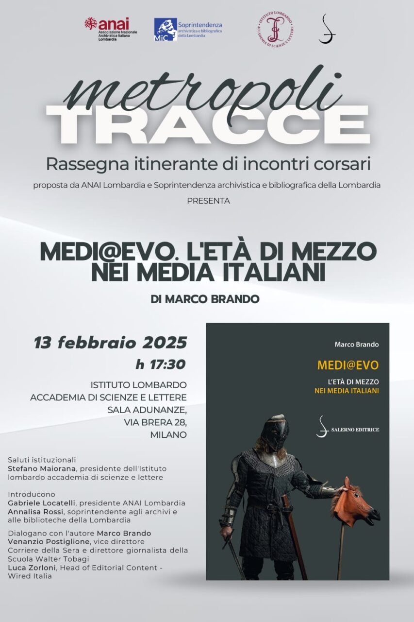 Giovedì 13 febbraio 2025, alle ore 17.30, presso la Sala Adunanze dell’Istituto Lombardo Accademia di Scienze e Lettere di Milano (Via Brera, 28) si terrà la presentazione del volume Medi@Evo.L’Età di mezzo nei media italiani di Marco Brando. Saluti istituzionali di Stefano Maiorana (Presidente dell’Istituto Lombardo Accademia di Scienze e Lettere). Introducono Gabriele Locatelli (Presidente ANAI Lombardia) e Annalisa Rossi (soprintendente agli archivi e alle biblioteche della Lombardia). Dialogano con l’autore Venanzio Postiglione (vice direttore del Corriere della Sera e direttore giornalista della Scuola Walter Tobagi) e Luca Zorloni (Head of Editorial Content – Wired Italia).