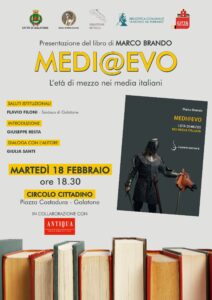 Martedì 18 febbraio 2025, alle ore 18.30, presso il Circolo Cittadino di Galatone (LE) – Piazza Costadura – si terrà la presentazione del volume Medi@Evo.L’Età di mezzo nei media italiani di Marco Brando. Saluti istituzionali di Flavio Filoni (Sindaco di Galatone) e Giuseppe D’Oria (Presidente Circolo Cittadino “Il Galateo”). Introduzione di Giuseppe Resta. Dialoga con l’autore Giulia Santi.