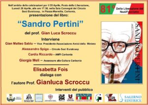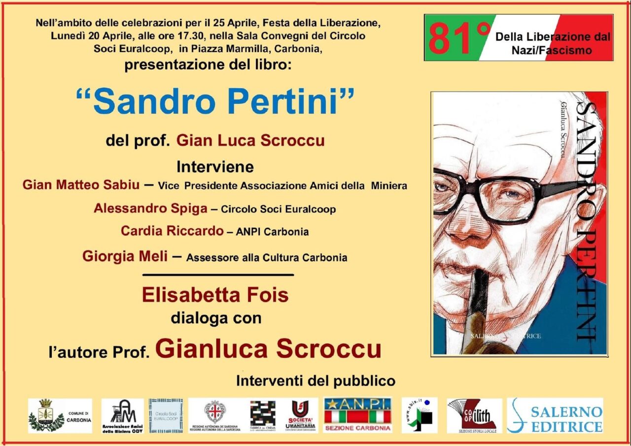 Lunedì 20 aprile 2026, alle ore 17.30, nell’ambito delle celebrazioni per il 25 Aprile, 81° anniversario della Liberazione dal Nazifascismo, presso la Sala Convegni del Circolo Soci EuralCoop (Piazza Marmilla) di Carbonia (SU) si terrà la presentazione del volume Sandro Pertini di Gianluca Scroccu. Dialoga con l’autore Elisabetta Fois. Interverranno Gian Matteo Sabiu (Vicepresidente Associazione Amici della Miniera), Alessio Spiga (Circolo Soci Euralcoop), Riccardo Cardia (Anpi Carbonia) e Giorgia Meli (Assessora alla Cultura del Comune di Carbonia).