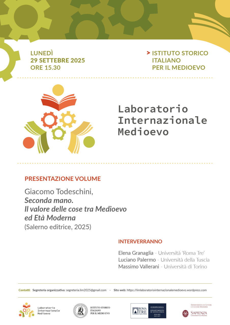 Lunedì 29 settembre 2025 alle ore 15.30, presso l’Istituto Storico Italiano per il Medioevo di Roma (Piazza dell’Orologio 4), si terrà la presentazione del volume Seconda mano. Il valore delle cose fra medioevo ed età moderna di Giacomo Todeschini. Conversano con l’autore con Elena Granaglia (Università Roma Tre), Luciano Palermo (Università della Tuscia) e Massimo Vallerani (Università di Torino).