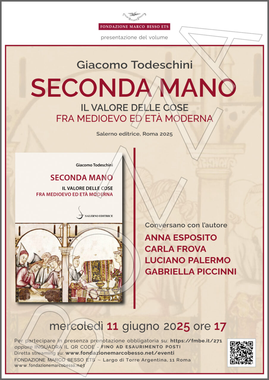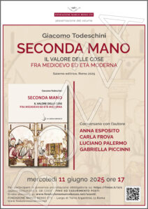 Mercoledì 11 giugno 2025 alle ore 17.00, presso la Fondazione Marco Besso di Roma (Largo di Torre Argentina, 11), si terrà la presentazione del volume Seconda mano.Il valore delle cose fra medioevo ed età moderna di Giacomo Todeschini. Conversano con l’autore Anna Esposito, Carla Frova, Luciano Palermo e Gabriella Piccinni.