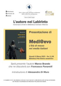 Giovedì 13 marzo 2025, alle ore 11.00, presso la Biblioteca Centrale di Ateneo dell’Università degli Studi della Basilicata di Potenza (Polo Storico Umanistico – Via Nazario Sauro, 85), si terrà la presentazione del volume Medi@Evo.L’Età di mezzo nei media italiani di Marco Brando. Sarà presente l’autore Marco Brando che ne discuterà con Francesco Panarelli. Introduzione di Alessandro Di Muro.